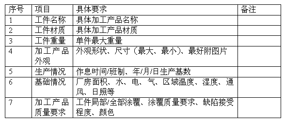 根据客户需求:产品年/日生产量、工件情况(工件外型尺寸、材质)、工作时间安排、产品涂覆要求(涂料选用、涂覆厚度/面积、检测标准)等方面来确定生产线设备及配套,生产工艺(节拍、方法),组成所需实际生产加工能力。