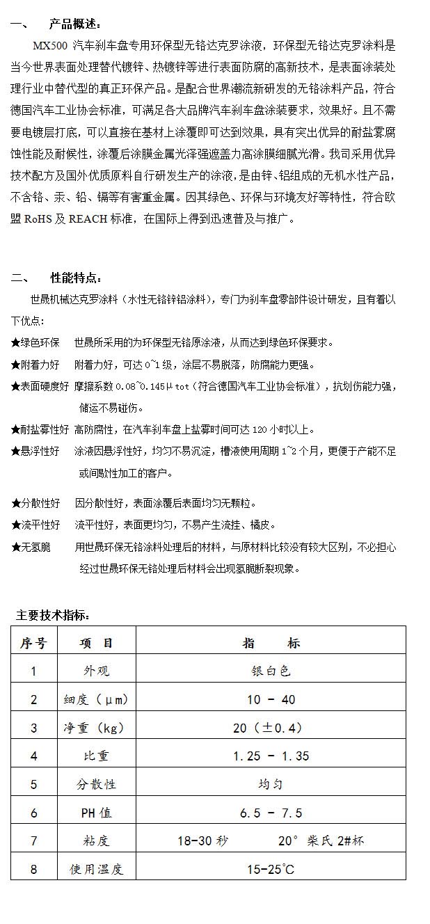 产品名称:MX500汽车刹车盘专用环保型无铬达克罗涂液